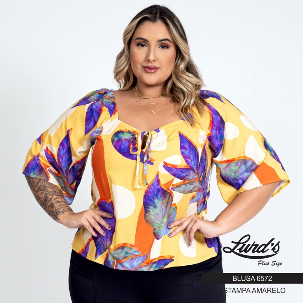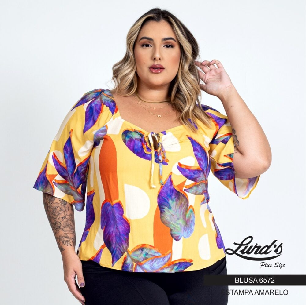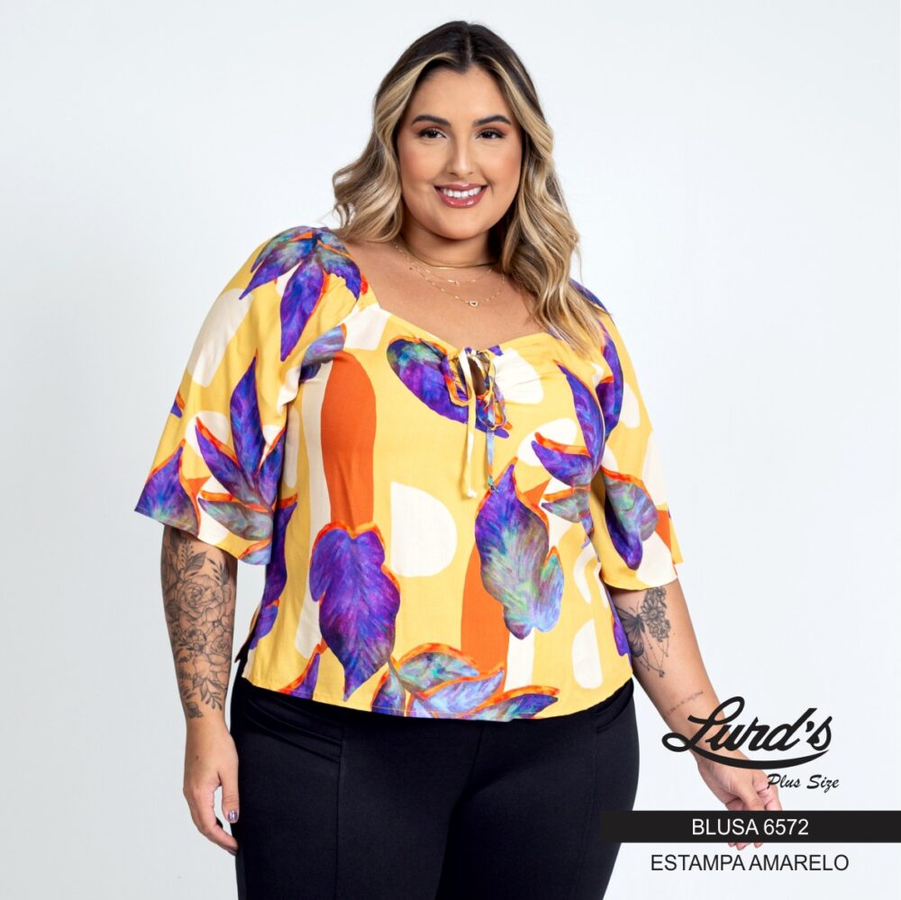 Blusa Feminina Plus Size Manga Curta Ref 6572 Estampa Amarelo - 48
