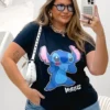 Blusa T-Shirts Feminina Plus Size Manga Curta STITCH-004 Preto