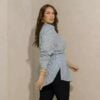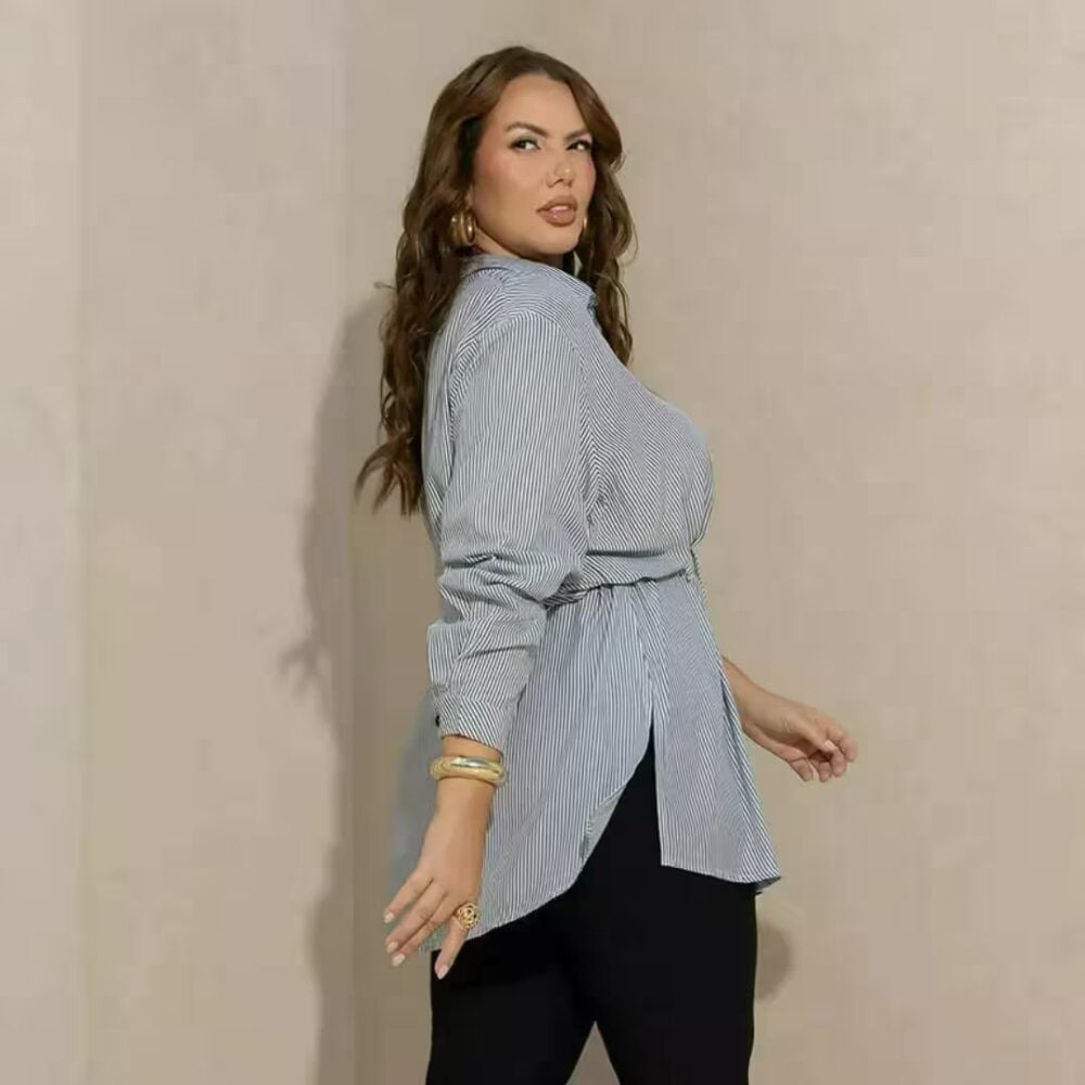 Elegante sem esforço, essa camisa é aquele clássico repaginado que valoriza o corpo plus com conforto e estilo. Na cor chumbo com listras finas, ela alonga a silhueta e traz um visual moderno na medida certa.