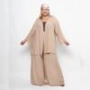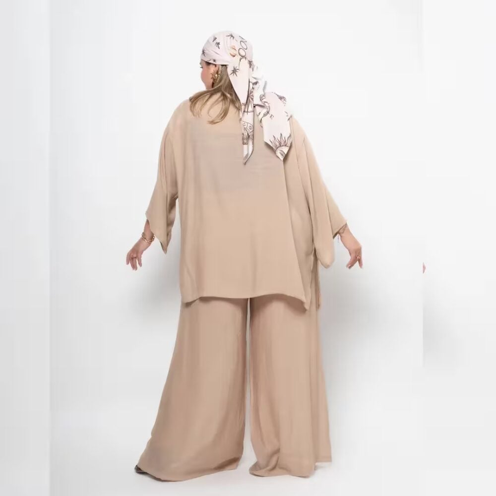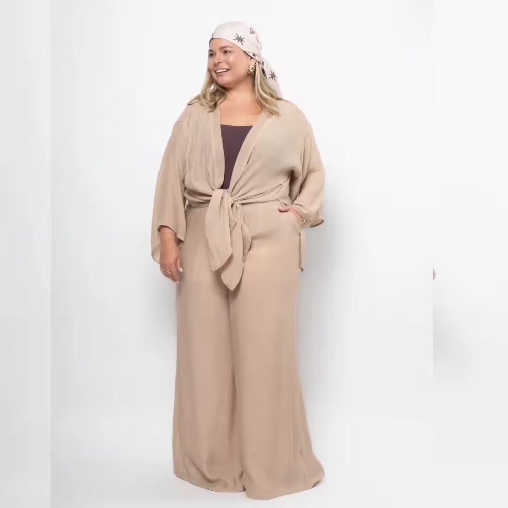 conjunto plus size verão, conjunto bege feminino, kimono plus size, calça pantalona viscose, look leve elegante, moda plus size confortável