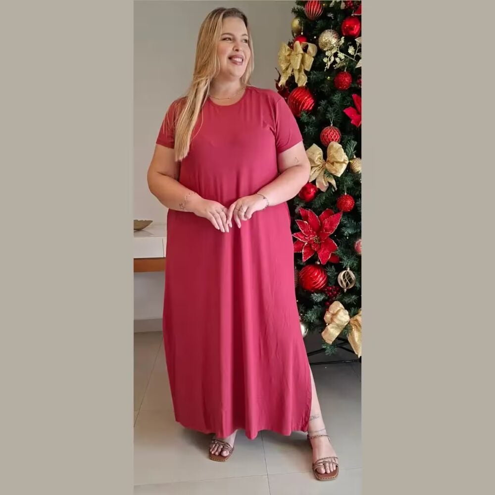 Vestido Longo Plus Size Manga Curta Ref VLM-222 Rosa Queimado - 60