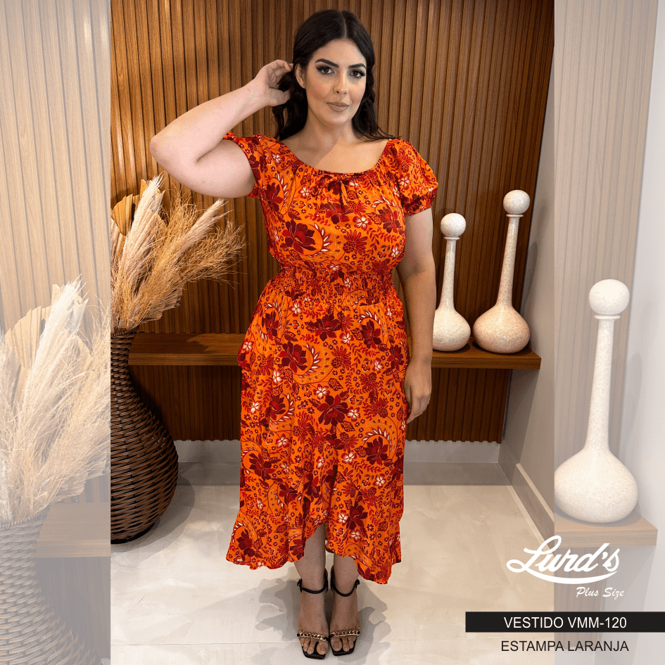 Vestido Mid Plus Size Manga Curta Estampa Laranja Marrie
